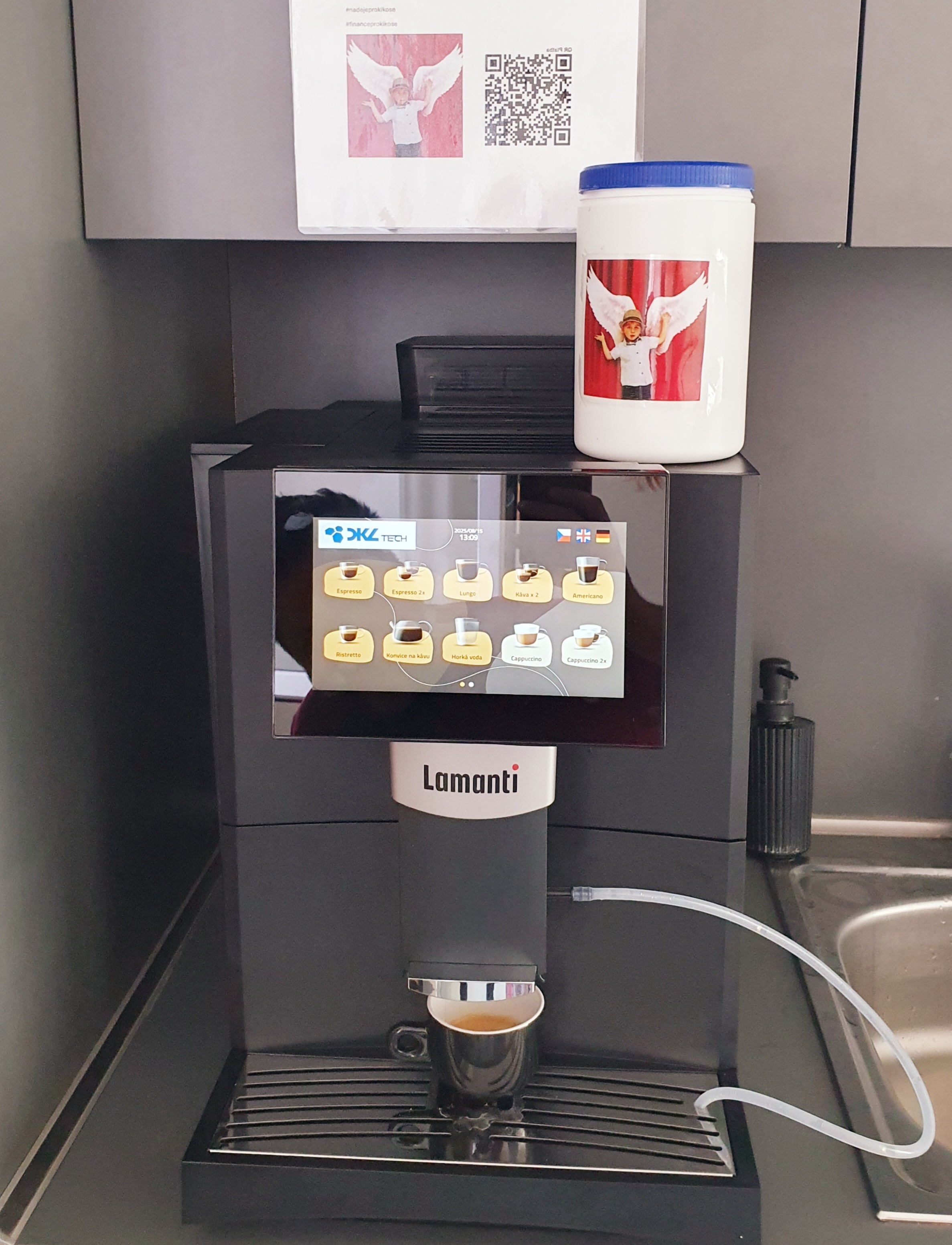 Káva je u nás k dispozici jak pro zaměstnance výroby, tak průmyslové automatizace a každý má možnost přispět buď do kasičky nebo prostřednictvím QR kódu.