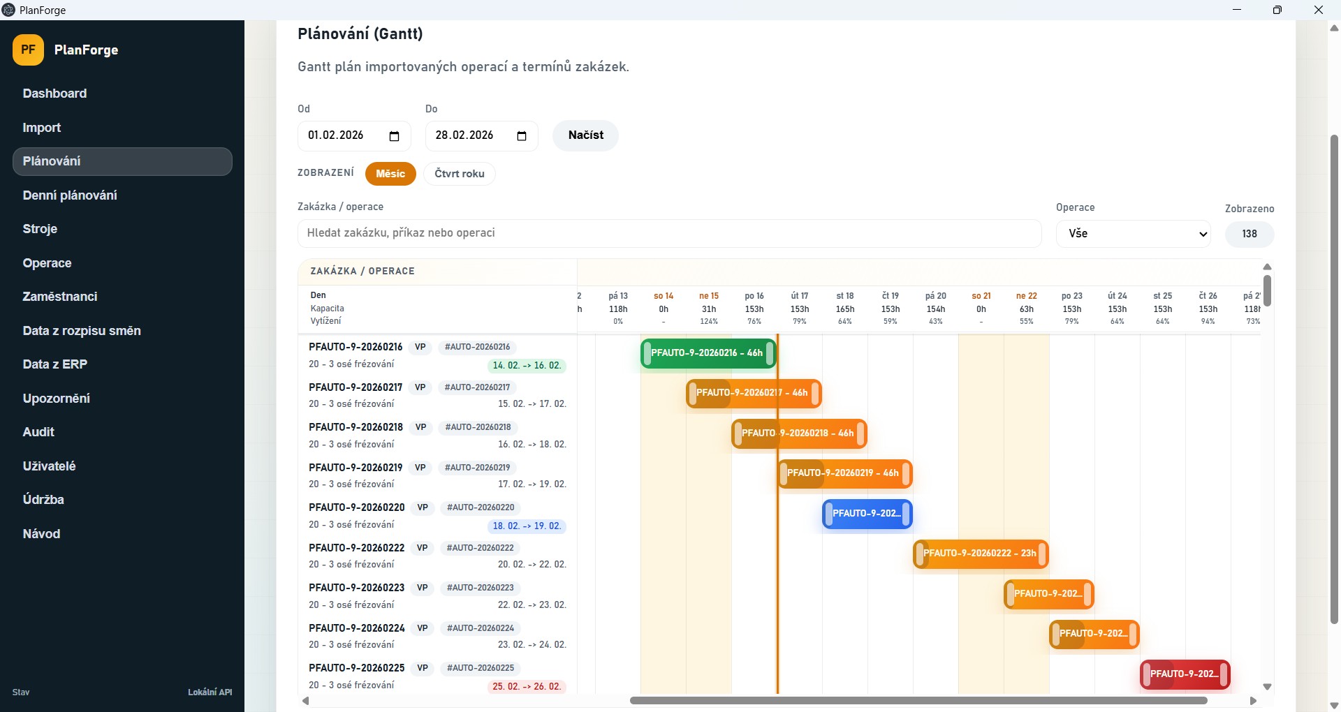 PlanForge je navržený pro výrobní firmy, které chtějí zrychlit plánování, omezit ruční přepisování dat a lépe řídit kapacitu v čase. Díky lokálnímu provozu (desktop aplikace + lokální API) je řešení rychlé, praktické a připravené pro každodenní operativu ve výrobě.