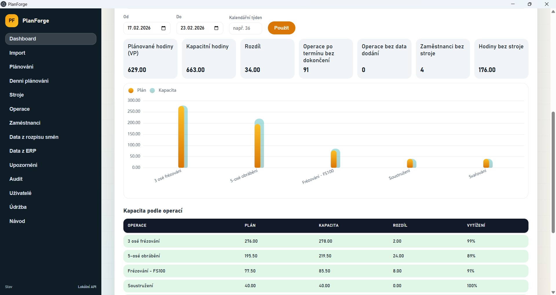 Na to navazuje dashboard s KPI, kapacitními přehledy, vytížením operací a upozorněními na deficit kapacity, zpoždění nebo chybějící data. Důležitou součástí je také auditní log, který ukazuje, co se kdy změnilo a kdo změnu provedl.